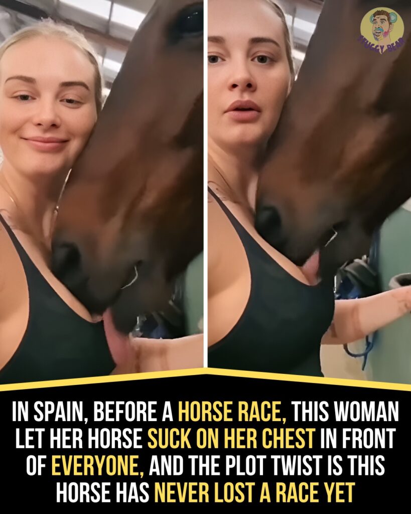 In a shocking pre-race moment captured on video at a Spanish horse track, a bold woman allowed her stallion to nuzzle and suck on her chest in front of stunned spectators and fellow competitors. The bizarre ritual quickly went viral, sparking massive debate across social media about animal behavior, superstition, and boundary-pushing stunts.