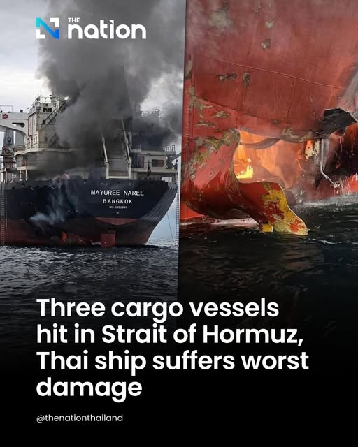 Three Thai crew members were still reportedly trapped on board a Thai cargo vessel after it was attacked in waters near the Strait of Hormuz on Wednesday, as the Royal Thai Navy stepped up efforts to coordinate urgent assistance.